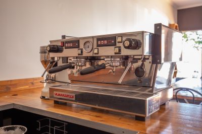 - Large bench-style service counters with modern coffee machine
