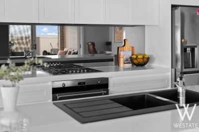 - Stunning monochrome chef's kitchen complete with SMEG appliances, self-cleaning oven, 60mm stone benchtops, walk-in pantry, glass splashback & abundant storage – perfect for entertaining